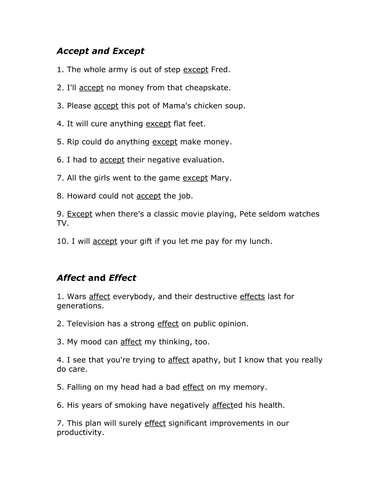The word affect is used as a verb.Affect effect worksheet answers teaching resources great to use as a starter so that students are clear which affect effect to use in a sentence.The lyrics had a big effect on sammie.