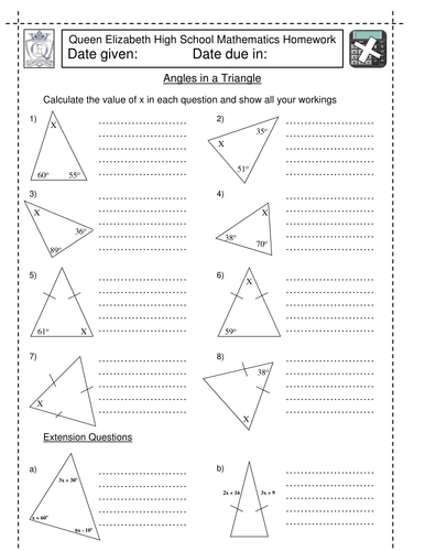 Angles in triangles worksheets with answers teaching.You can solve these problems in a variety of ways my favorite is to set up and solve an equation that s equal to 180 like 5x x 7 75 180.These angles worksheets will produce 20 problems for the student to identify whether the angle is acute obtuse right or straight.