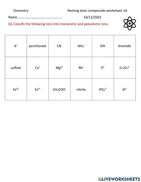 The first box is the.Nomenclature binary ionic compounds worksheet 4 f 19 name a binary ionic compound consists of a positively charged metal and a negatively charged nonmetal.Write a correct chemical formula for each of the following binary compounds.
