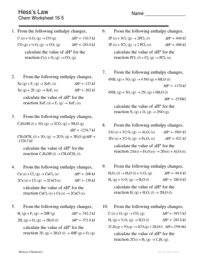 Student id work in groups on these problems.Hess s law worksheet rancho high school hess s law worksheet calculate h for the reaction.You should try to answer the questions without referring to your textbook.