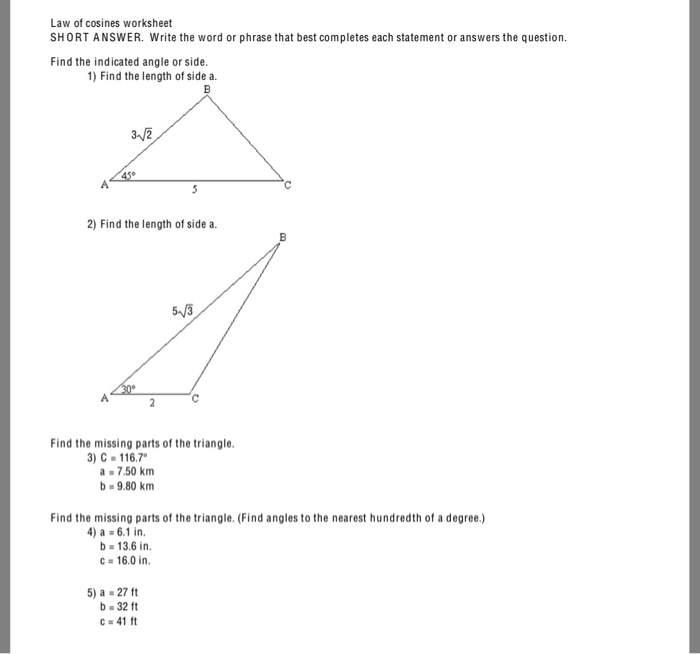 Name c b a 5 70 1 2 c a b 9 c a b 5 7 79 3 4 c a 6 a b 138 5 6 c a b 9 6 c a b 9 5 7 54 7 8 c a b 5 4 c 4 73 5 12 5 62 123 28 b 20 5.Law of cosines worksheets law of cosines worksheets answer to the nearest tenth.1 2 c c 13 yd 26 m 18 m 37 a b 22 yd b a 24 m 3 4 a 30 ft b c a 130 11 ft 10 ft 24 ft b 17 ft 5 c 6 c a 14 cm 6 cm 32.