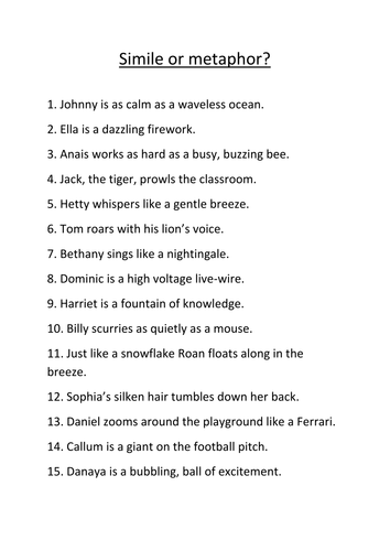 I have separated the metaphors on this page into two lists.She forgot her glasses and felt as blind as a bat so she had difficulty reading.Below are six versions of our grade 5 vocabulary worksheet that asks students to mark each sentence as a simile or a metaphor.